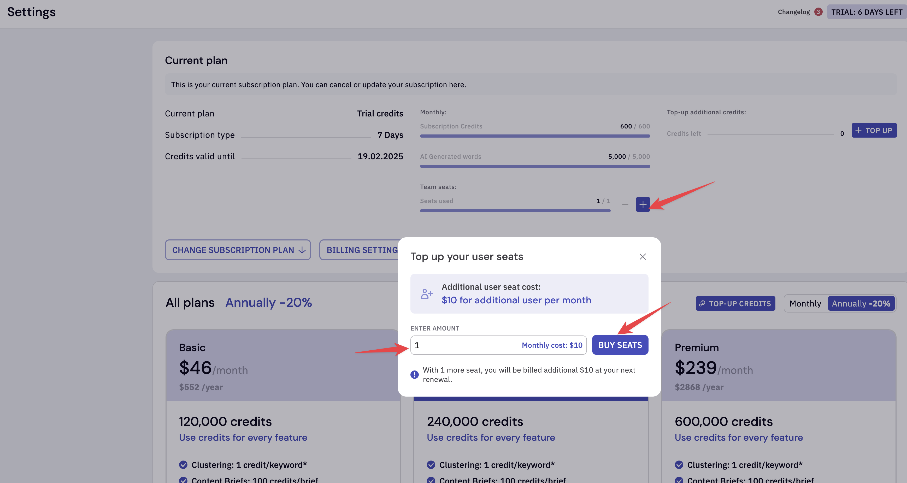 Go to Settings -> Click the + icon next to seats, select the number of seats and click buy.