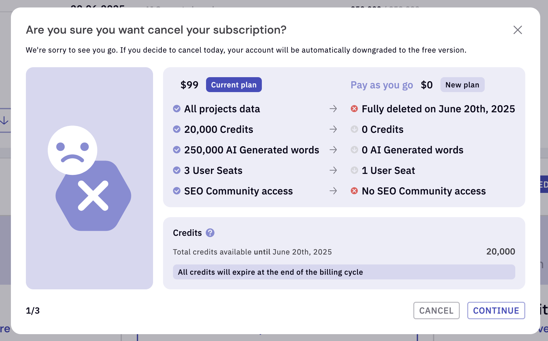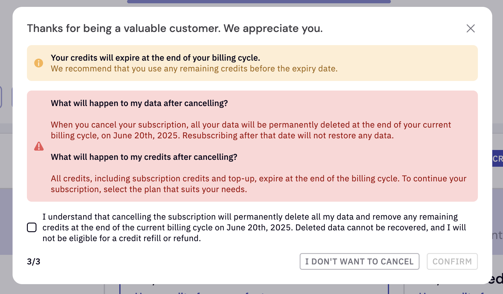 If you cancel your subscription, we will delete your data at the end-of-billing date. All of your data is permanently deleted, and we will never be able to recover the data for you. Please make sure to export and back up your data before you cancel.Tip: To avoid losing your data, consider pausing your subscription instead of canceling it. You can pause for up to 3 months, twice per year, during which we’ll securely store your data, settings, and other account details. You can unpause at any time to resume access.