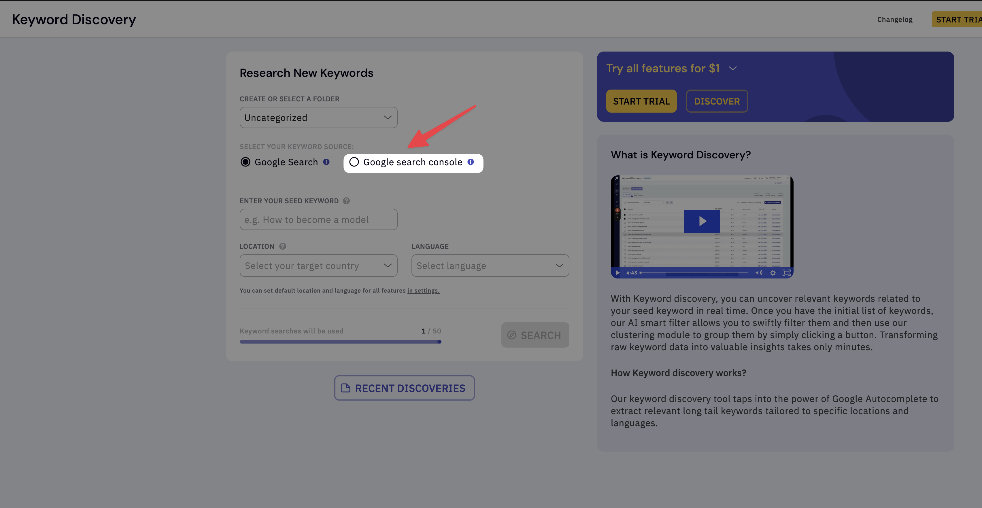 There are two ways to integrate Google search console with Keyword insights.- Under integrations page.